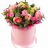 Состав: роза - 5 шт., роза кустовая - 5 шт., гвоздика, хризантема, зелень, оазис, коробка.